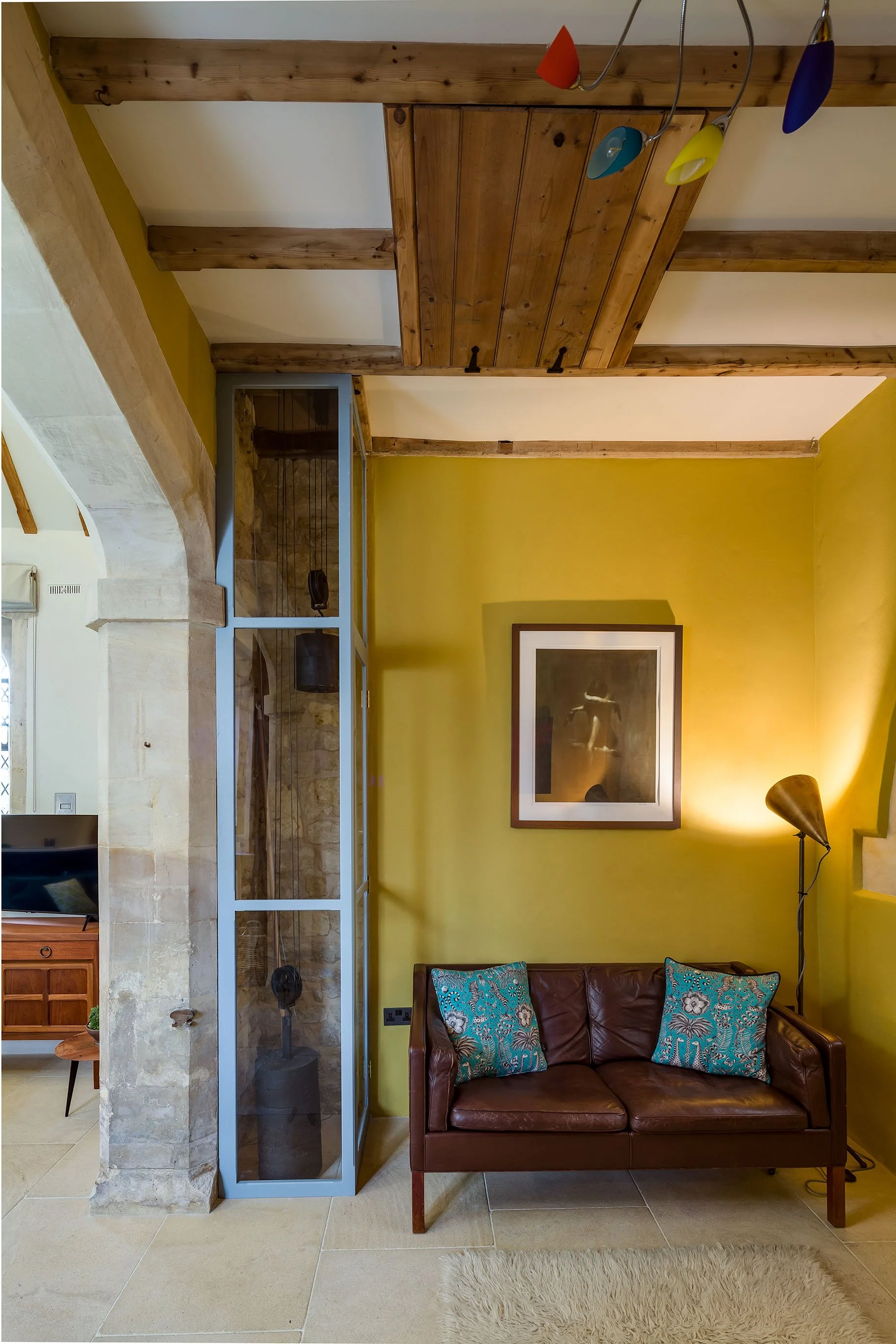 The final finishing touches are credit to the love and dedication that Geoff and Julie have given the project provided reusing items salvaged from church. A lantern purchased with the building has been restored to be the main light in the living room. The pulpit has become a table and a headboard. The Bell chime mechanism has been restored by Paxford Engineering, new door runners fabricated by MRK and the clock face sprayed at Brothertons, all businesses based on the Northwick Park Estate.